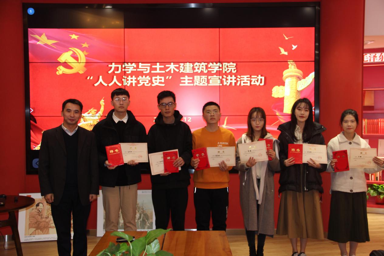 活动中12名选手以口述、PPT放映、视频播放等不同形式进行了展示,紧紧围绕中国共产党百年奋斗的光辉历程,中国共产党始终不渝为人民的初心宗旨,中国共产党在长期奋斗中铸就的伟大精神等内容,用生动的语言和丰富的情感讲述了一个个可歌可泣的红色故事,奉献了一场红色精神盛宴。史明明同志为大家再现了新民主主义革命史;周星宇同志以延安整风运动、建国初期、十一届六中全会为时间点为大家讲述了党的理论研究史;张书成同志讲述了人民政协的诞生;姜逸凡同志选择了具有代表性的战役百团大战;侯宇超同志和苏天雄同志分别讲述了杨开慧、刘胡兰两位女烈士的革命故事;侯思凡同志讲述了贺页朵坚守入党誓词的故事;曹瑞同志讲述了华航西迁精神;宋郭睿同志为大家讲述了疫情时期无数平凡而又伟大的普通人......每一个人物,每一个事迹,都蕴含着讲述者对他们的敬意,激发了同学们的爱国热情。本次活动评选出一等奖二名、二等奖四名、三等奖六名,前六名的同学被授予宣讲员聘书,将在今后为学院各支部、班级进行党史宣讲。