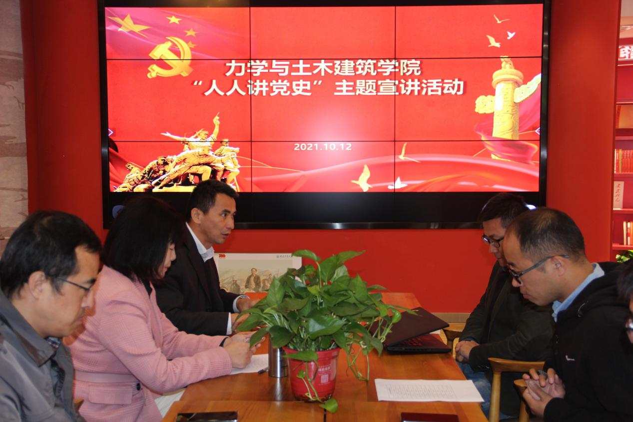 为深入贯彻落实中共中央关于党史学习教育的重要部署和习近平总书记在党史学习教育动员大会上的讲话精神,积极响应《关于在全校学生中开展“人人讲党史”活动的实施方案》,2021年10月12日,力学与土木建筑学院在延安精神党员活动中心开展了“人人讲党史”活动,学院党委副书记(主持工作)巨维博、党委委员张娟、党委委员王安强、各级辅导员参加了此次活动。