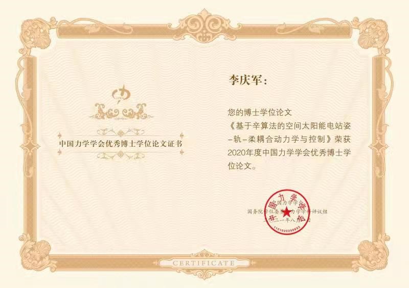 我院毕业博士生李庆军的博士学位论文《基于辛算法的空间太阳能电站姿-轨-柔耦合动力学与控制》荣获“2020年度中国力学学会优秀博士学位论文”,导师荣获“2020年度中国力学学会优秀博士学位论文导师”称号。