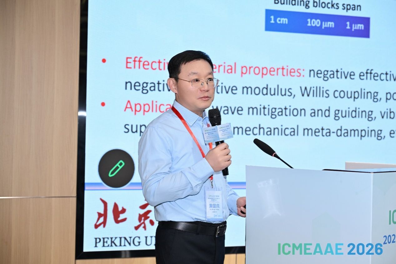 北京大学黄国良教授作题为《智能结构材料与动力学:新力学理论及其应用》的报告,围绕智能结构材料及其动力学问题展开研究,重点介绍了主动微结构设计、新型波动现象及其工程应用,为低频振动控制等领域提供了重要理论支撑。