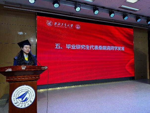 典礼第五项,毕业研究生代表桑瑞涓同学发言,桑瑞涓同学分享了读研期间的成长感悟与收获,表达了对学院培养、导师指引与同窗陪伴的由衷感谢。